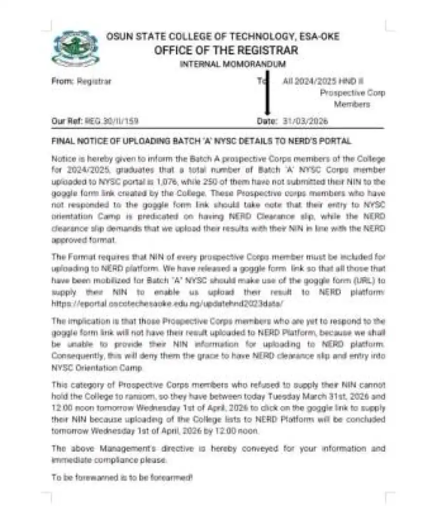 This category of Prospective Corps members who refused to supply their NIN cannot hold the College to ransom, so they have between today Tuesday March 31st, 2026 and 12:00 noon tomorrow Wednesday 1st of April, 2026 to click on the goggle link to supply their NIN because uploading of the College lists to NERD Platform will be concluded tomorrow Wednesday 1st of April, 2026 by 12:00 noon.