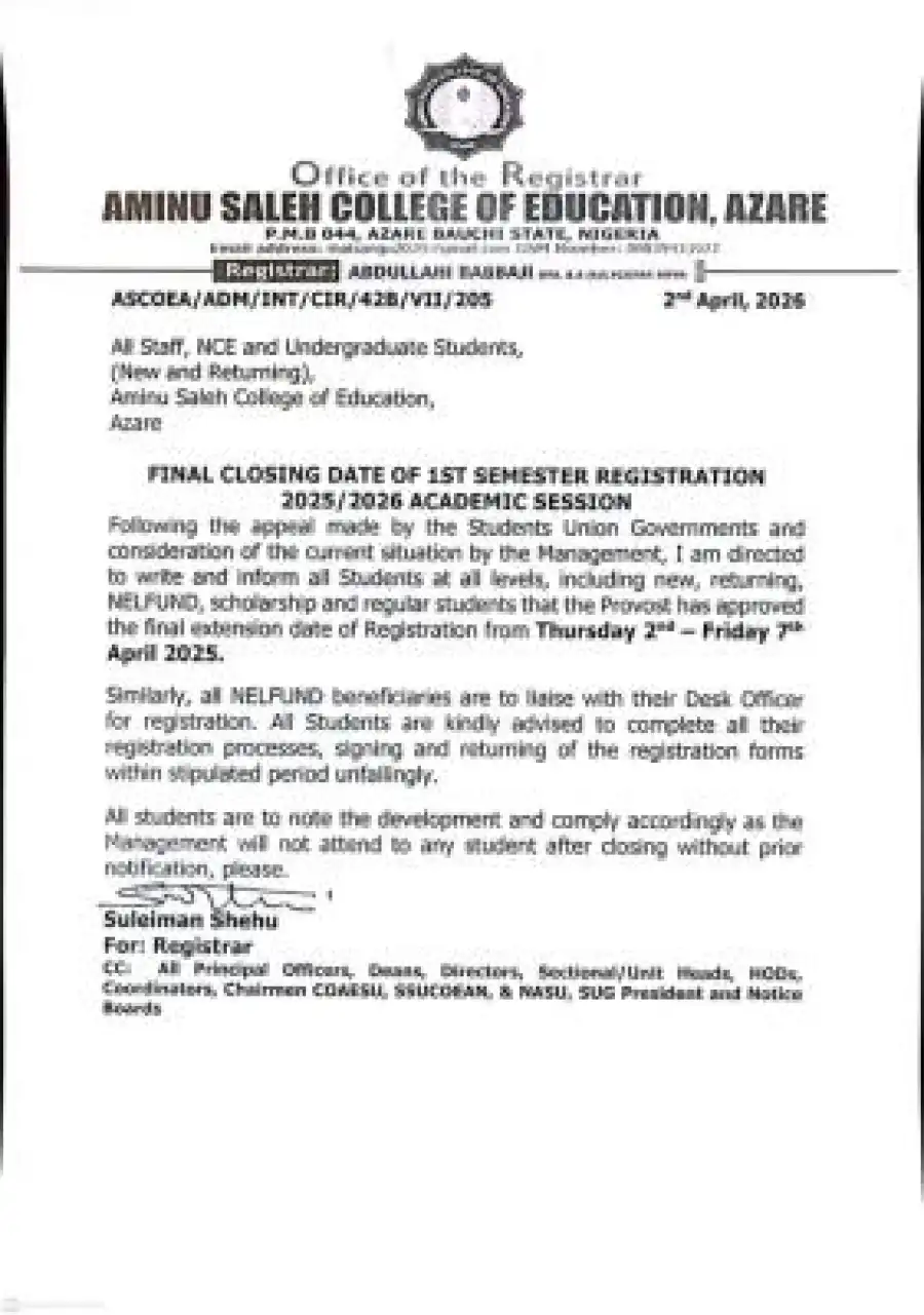 The Management of Aminu Saleh College of Education, Azare, has announced a final extension of the 1st Semester registration deadline for the 2025/2026 academic session.