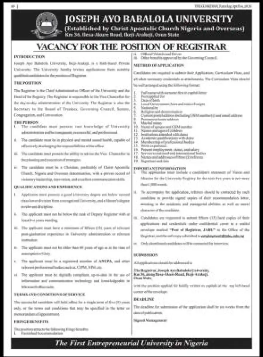 Joseph Ayo Babalola University, Ikeji-Arakeji, is a faith-based Private University. The University hereby invites applications from suitably qualified candidates for the position of Registrar.